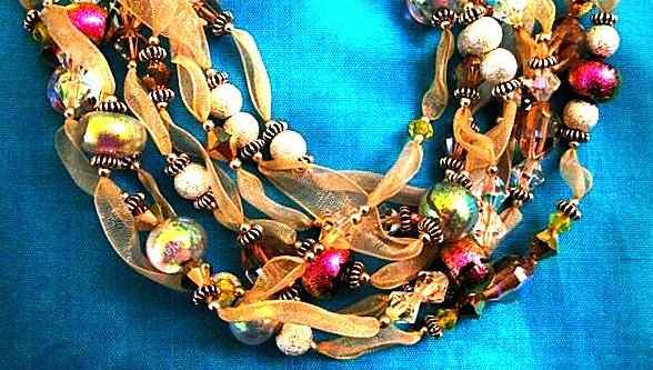 Over the years, all my daughters have created unique presents for me. The jewelry has evolved in both materials and design from simple single strand beaded bracelets and necklaces to more complex ones with silver wraps and Murano beads or pearls and organza ribbons.