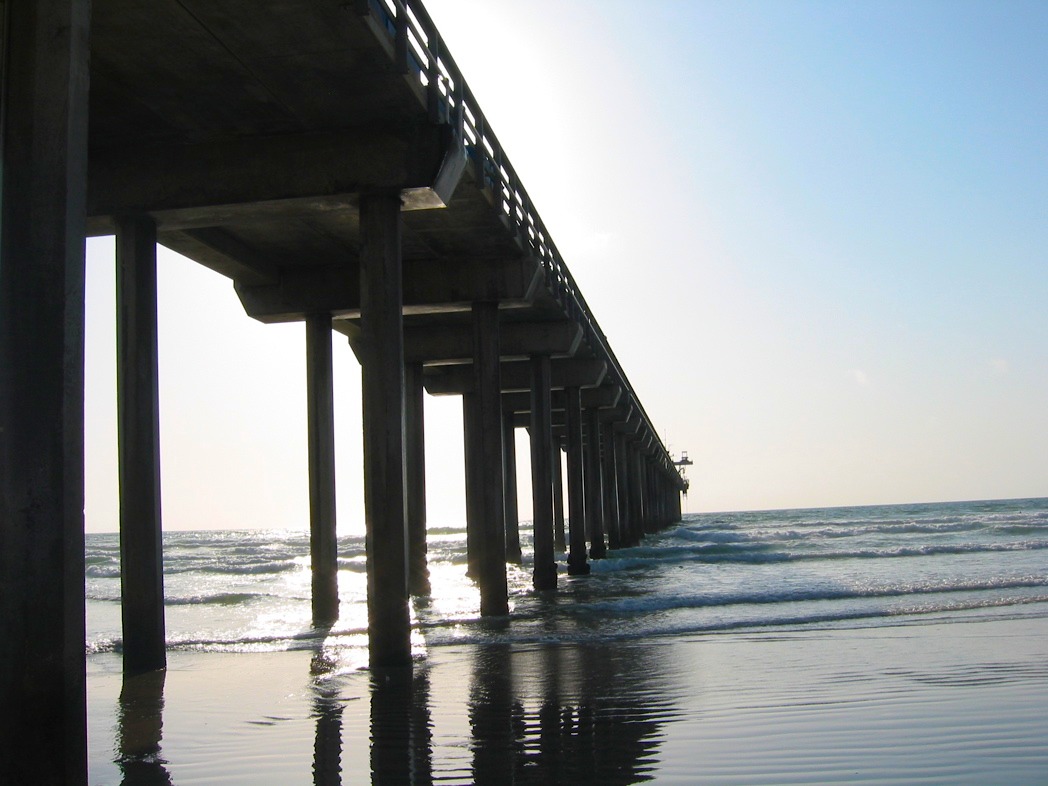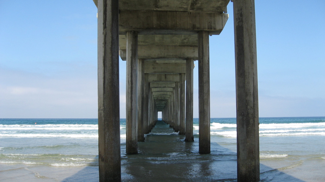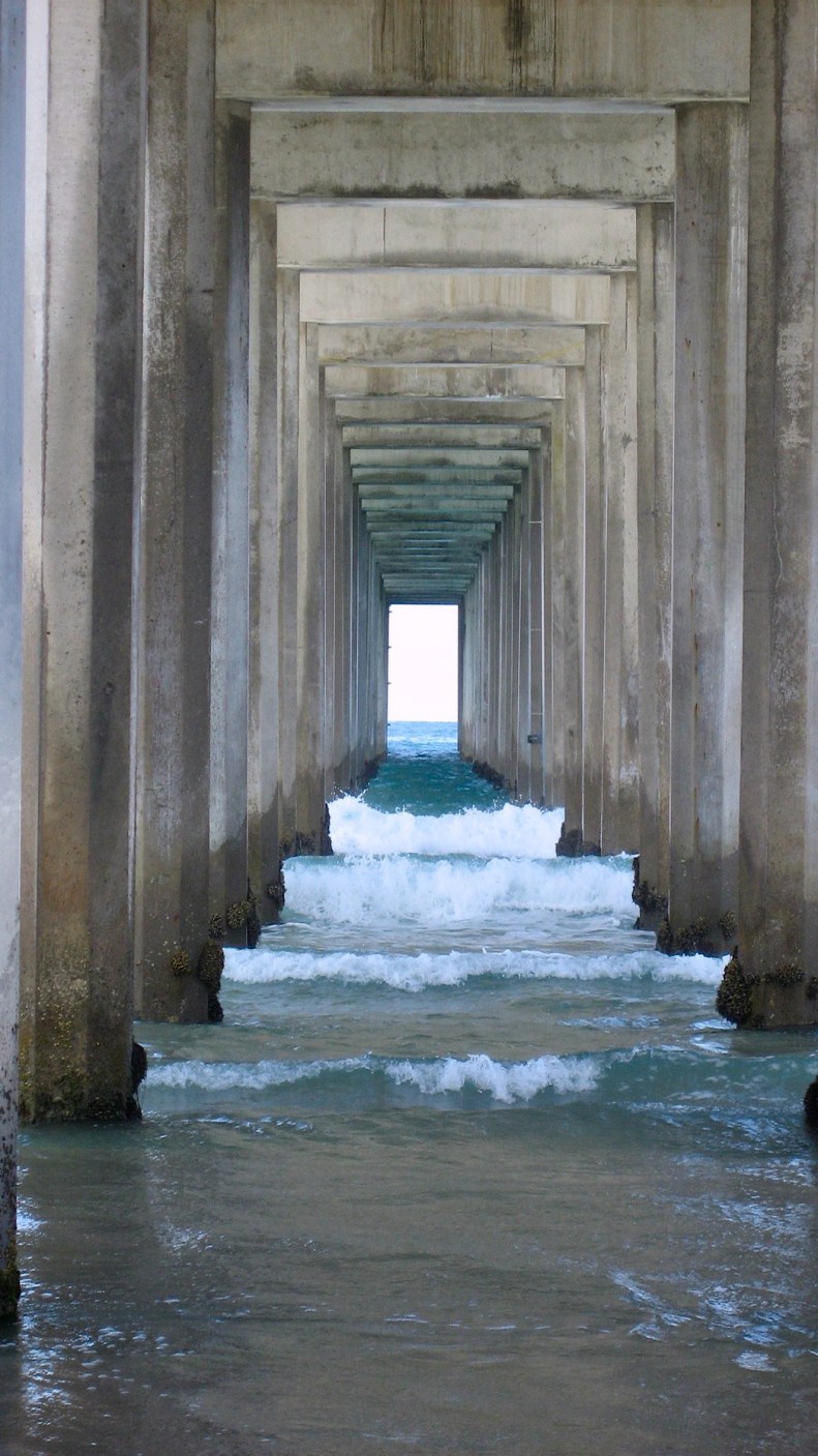 Scripps Beach near the Institute is one of my favorite beaches in the San Diego area. The underbelly of the pier fascinates me. Standing at the spot where the posts line up perfectly, the surf sounds seductive – like a Siren-song, and I am lured to the portal at the end of the pier and the sea beyond.