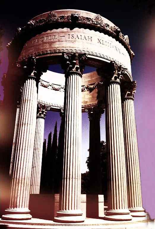 Architect William Merchant designed this Beaux Arts temple in the 1930s with a classical circle of corinthian columns and an ornate masonry ring. It is located in Woodside, California at the Hetch Hetchy Aqueduct’s terminus. A reflecting pool lies beyond the temple.