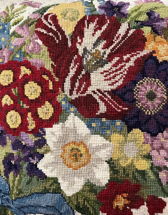 After examining the needlepoint canvas further and determining that I had just enough wool to complete it, I resolved to push through and finish it. It took me just over a month of incessant work. It is, hands down, my favorite needlepoint piece to date. I sewed it into a pillow using silk fabric backing and velvet piping from Chennai and wool stuffing from a sheep farm in Pennsylvania. I love it and it was well worth the effort!