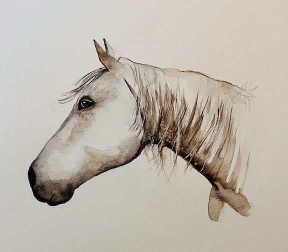 © Joan Currie. My White Horse watercolor. Reference photo by Jane Davies.