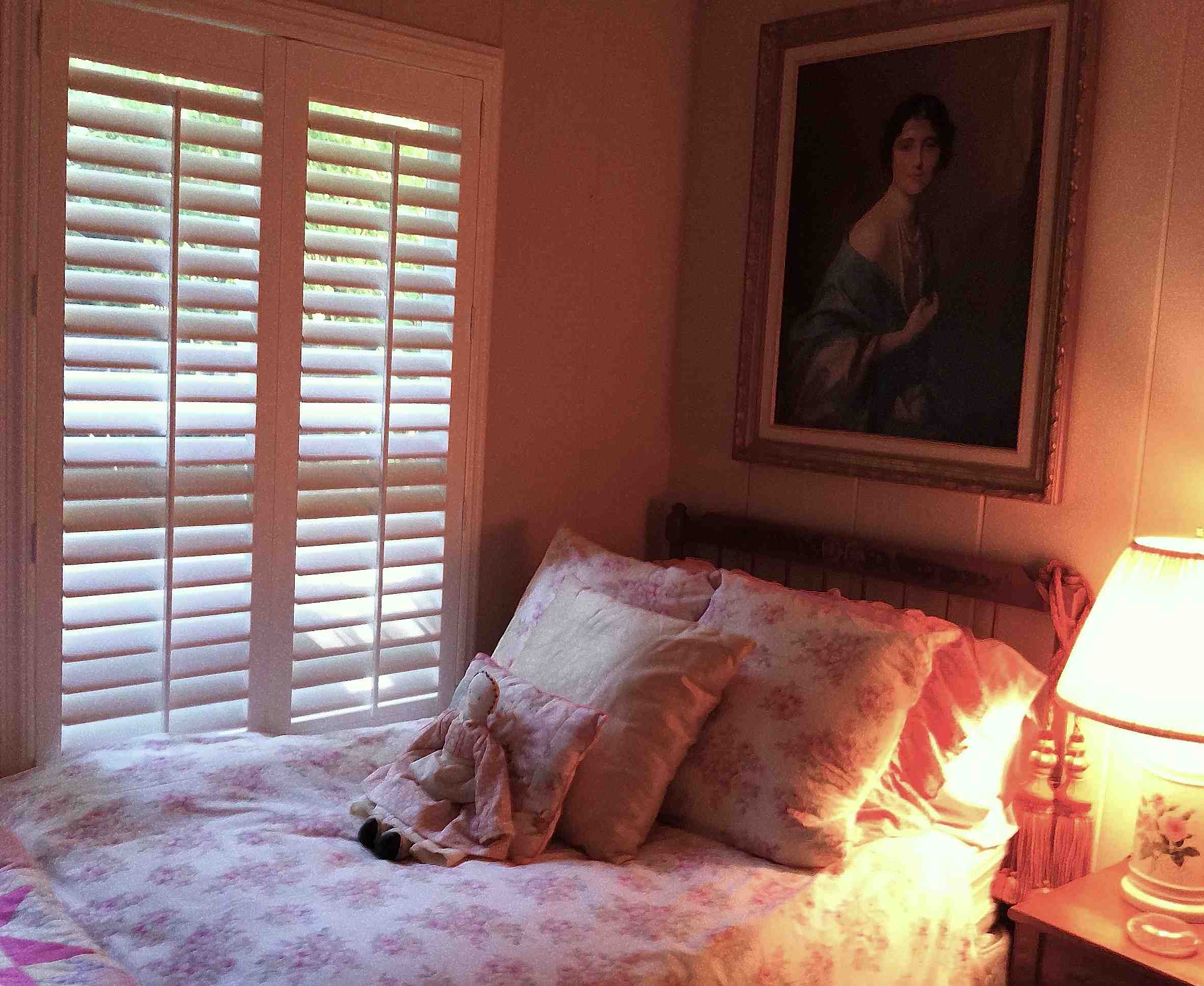 The Queen Mother watches over this Laura Ashley-inspired pink room.